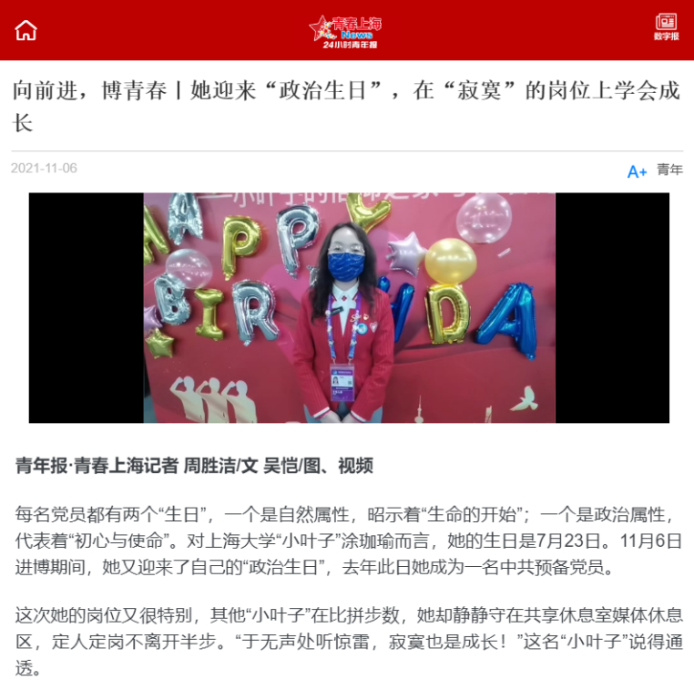 作为一名政治生日在进博会期间的小叶子和上大志愿者队伍党团活动的策划人,她也更加鲜明地认识到,作为党员一定要有“功成不必在我”的精神境界和“功成必定有我”的担当。每个党员都应当成为一束光,无论是照亮身旁,还是照亮更多的地方。她在无私奉献的志愿服务中,践行和感悟自己身上的使命和担当。其个人事迹也被《中国青年报》《文汇报》等多家主流媒体报道。