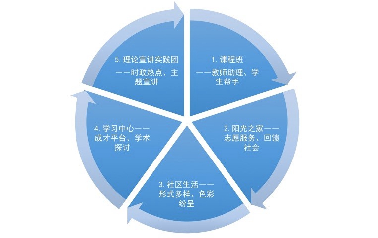 “党员示范岗”项目有五个成熟的板块:课程班、“阳光之家”志愿服务、员工社区、学习场所、理论宣讲实践团。
