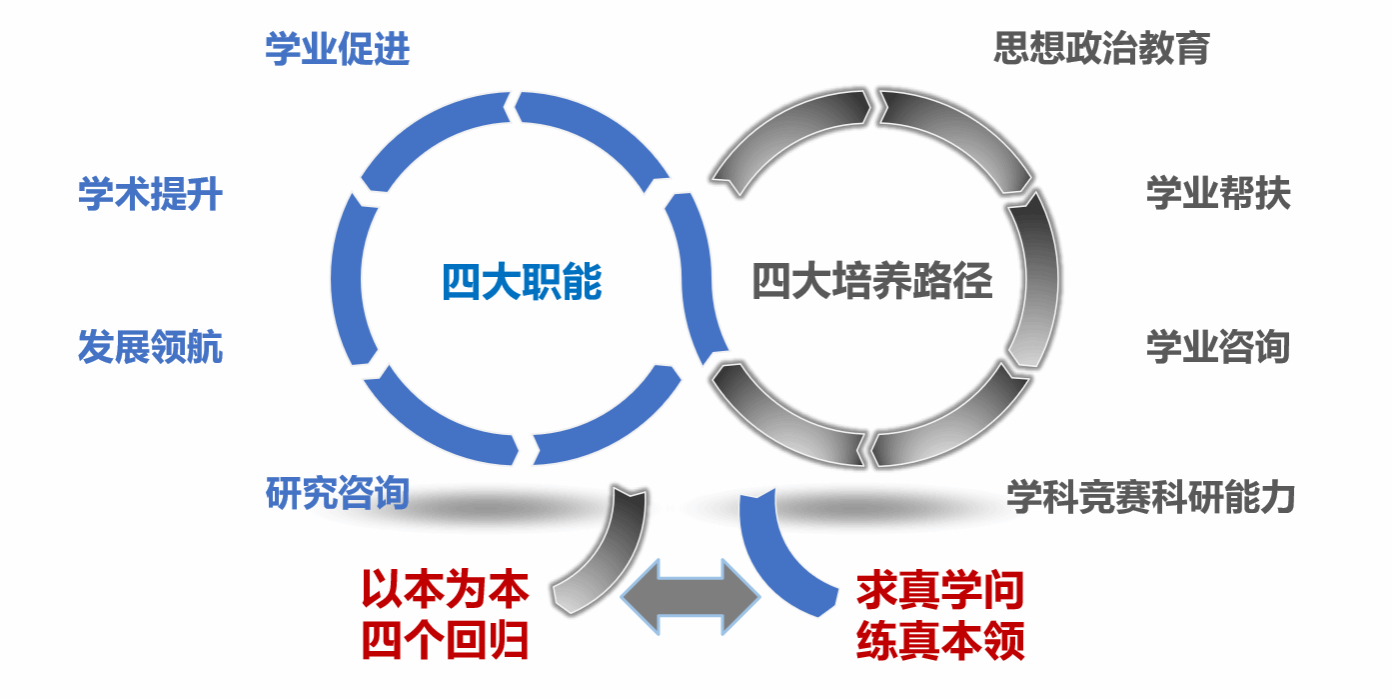 文荟学业发展指导中心队伍完善,职能分工明确,已形成中心建设团队、学术导师团队、朋辈导师团队三支队伍做保障。